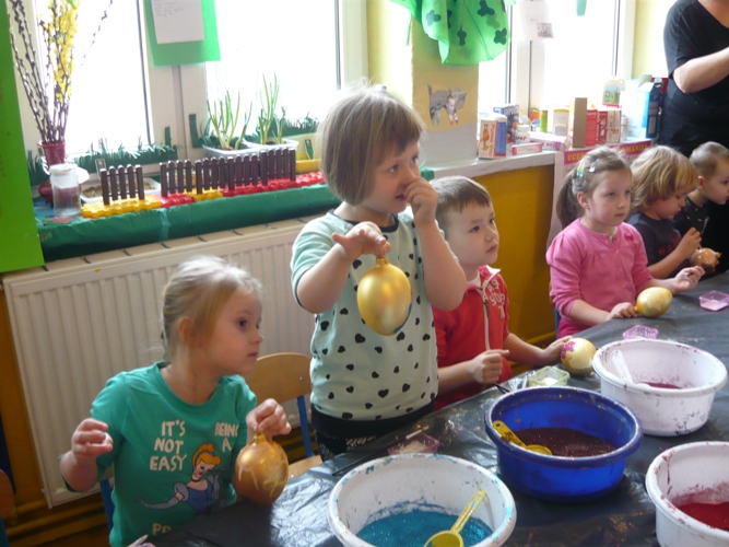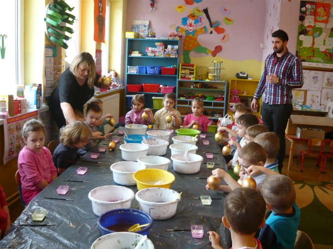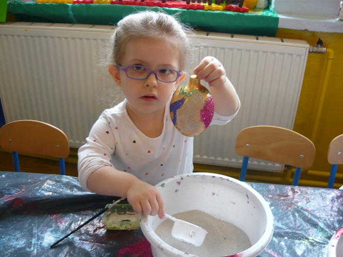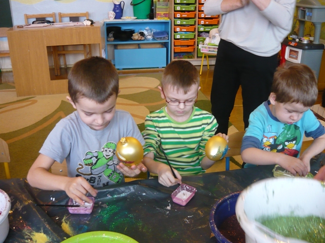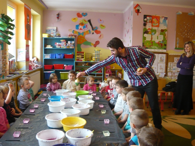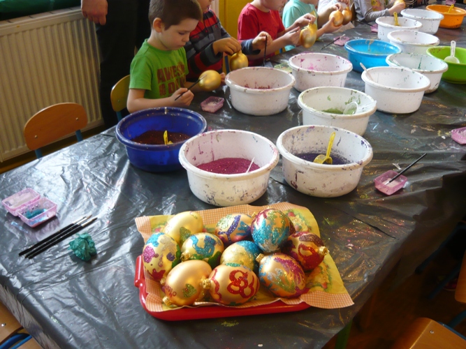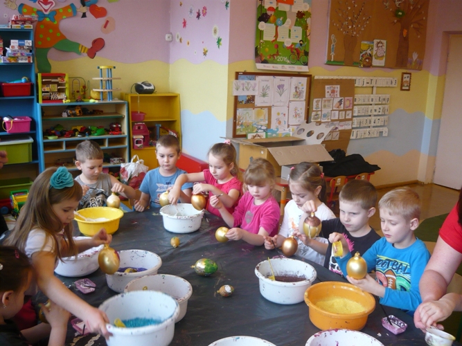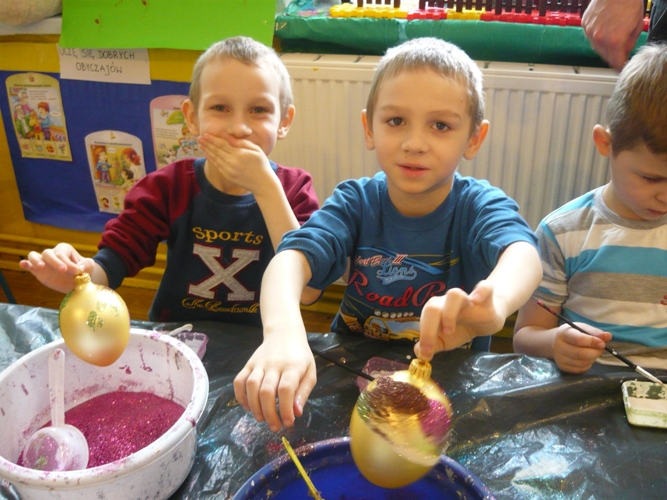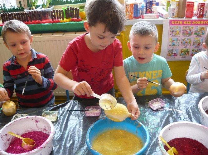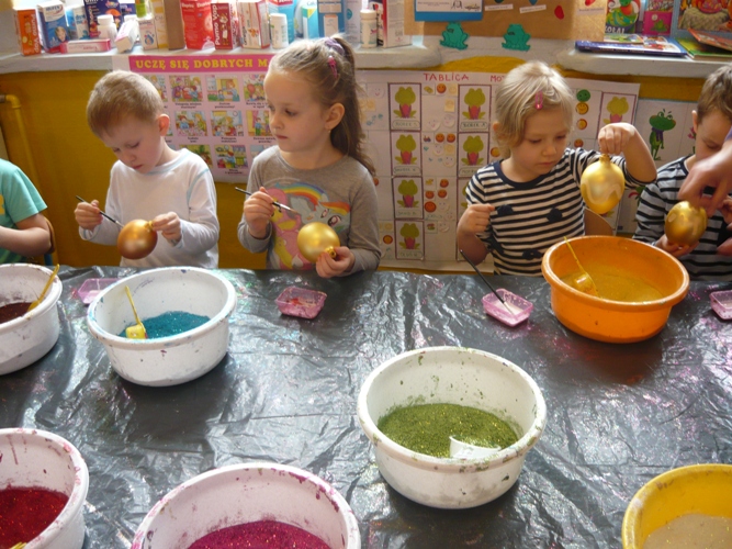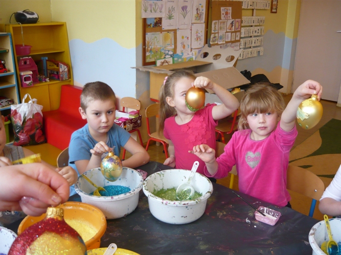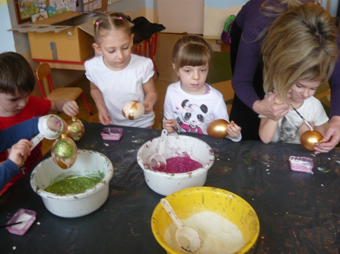 Z okazji zbliżających się Świąt Wielkanocnych w dniu 5 marca dla chętnych przedszkolaków zorganizowane zostały warsztaty plastyczne, które prowadziła firma „Diamentis”- ozdoby szklane z Rozprzy.Celem warsztatów było zapoznanie dzieci z tradycją wielkanocną, z ich symboliką oraz rozwijanie umiejętności manualnych dzieci. Uczestnicy spotkania zostali zapoznani z symboliką jajka wielkanocnego oraz sposobem jego dekorowania. Następnie każde dziecko otrzymało szklane jajko, które mogło własnoręcznie ozdobić kolorowym brokatem wg własnego pomysłu. Tak pięknie udekorowane jajka przedszkolaki zabrały do swoich domów, aby mogły zdobić wielkanocne stoły.
