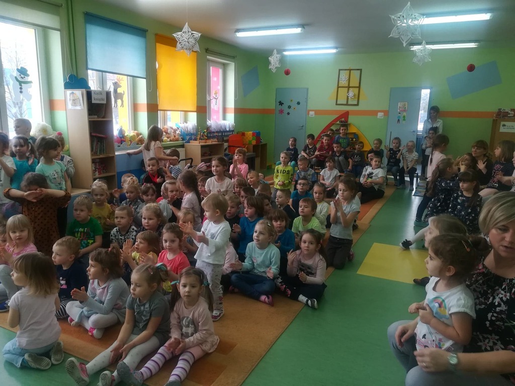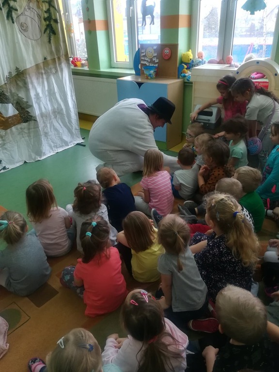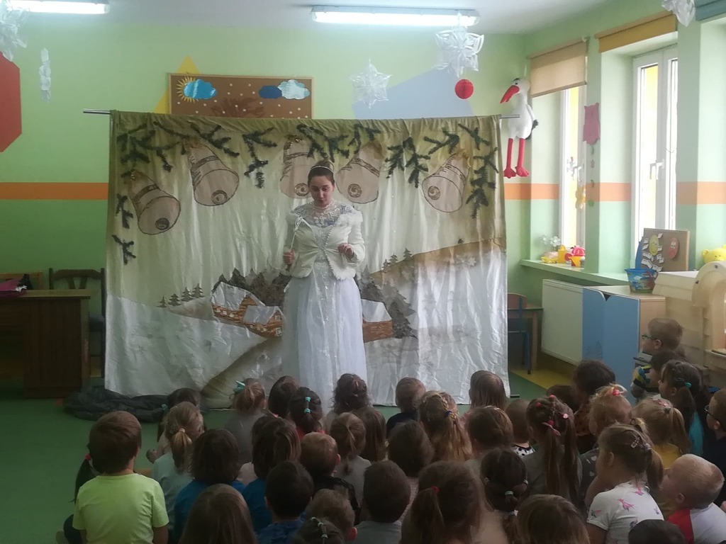 W dniu 6 lutego w naszym przedszkolu gościł teatr ,,Magik” z Białegostoku ze spektaklem pt. ,,Pierwsza zima bałwanka Stefanka”. W ciekawy i zabawny sposób aktorzy mówili o przyjaźni, dobroci, życzliwości i pomaganiu słabszym. Zwrócili uwagę na odpowiedni strój do warunków pogodowych, uświadomili konieczność dokarmiania zwierząt w czasie zimy, przestrzegali dzieci przed niebezpieczeństwami zimowych zabaw oraz pokazali jak można bawić się bezpiecznie. Przypomnieli również dzieciom numery telefonów alarmowych. Bajka zaciekawiła wszystkich przedszkolaków, którzy z dużym zainteresowaniem oglądali przedstawienie. Wszystkim dopisywał wspaniały humor. Było super!