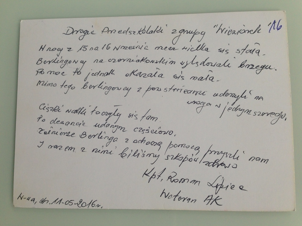 12 września 2018r w ramach projektu „Piękna Nasza Polska Cała” przedszkolaki z grupy 6 –l. „Wiewiórki” oraz inne grupy z naszego przedszkola, wysłały kartkę do uczestników Powstania Warszawskiego. Wszystkie karty zawierały wyrazy wdzięczności za trud i poświęcenie w walce o wolność naszej ojczyzny. Cieszymy się niezmiernie, bo Przedszkolaki z grupy 6 – l. „Wiewiórki” otrzymały w czerwcu 2019r. piękną pamiątkę – Kartkę od Powstańca. Napisał ją własnoręcznie uczestnik Powstania Warszawskiego – kpt. Roman Lipiec, pseudonim „Adam” – weteran AK. W Powstaniu był starszym strzelcem w Zgrupowaniu „Zaremba-Piorun”, Śródmieście Południowe. To dla naszego przedszkola wielki zaszczyt i uznanie, a dla przedszkolaków wspaniała pamiątka łącząca pokolenia. Dziękujemy! Pamiętamy!