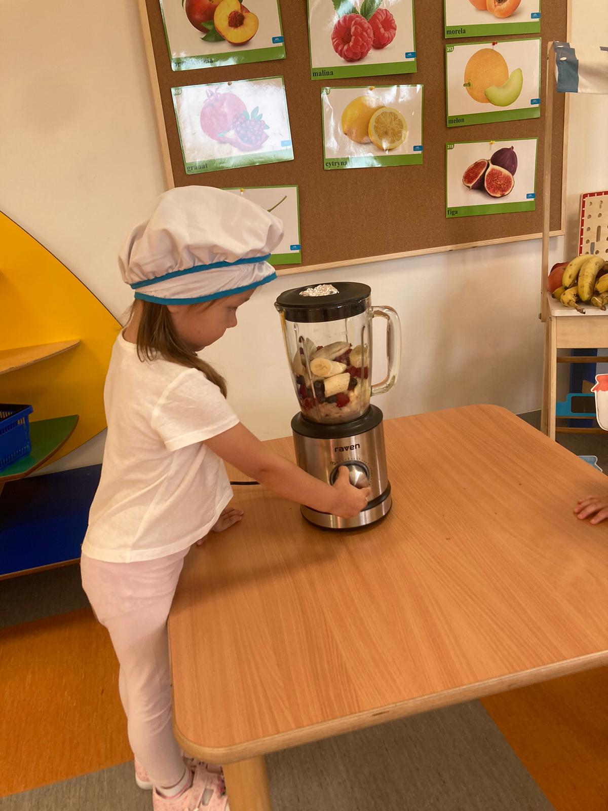 Z przygotowanych składników wspólnie wykonały przepyszny owocowy mus. To była świetna aktywność, która połączyła edukację z zabawą oraz pozwoliła dzieciom poznać etapy jego powstawania. Na zakończenie wszyscy mogli skosztować musu z ulubionych owoców.