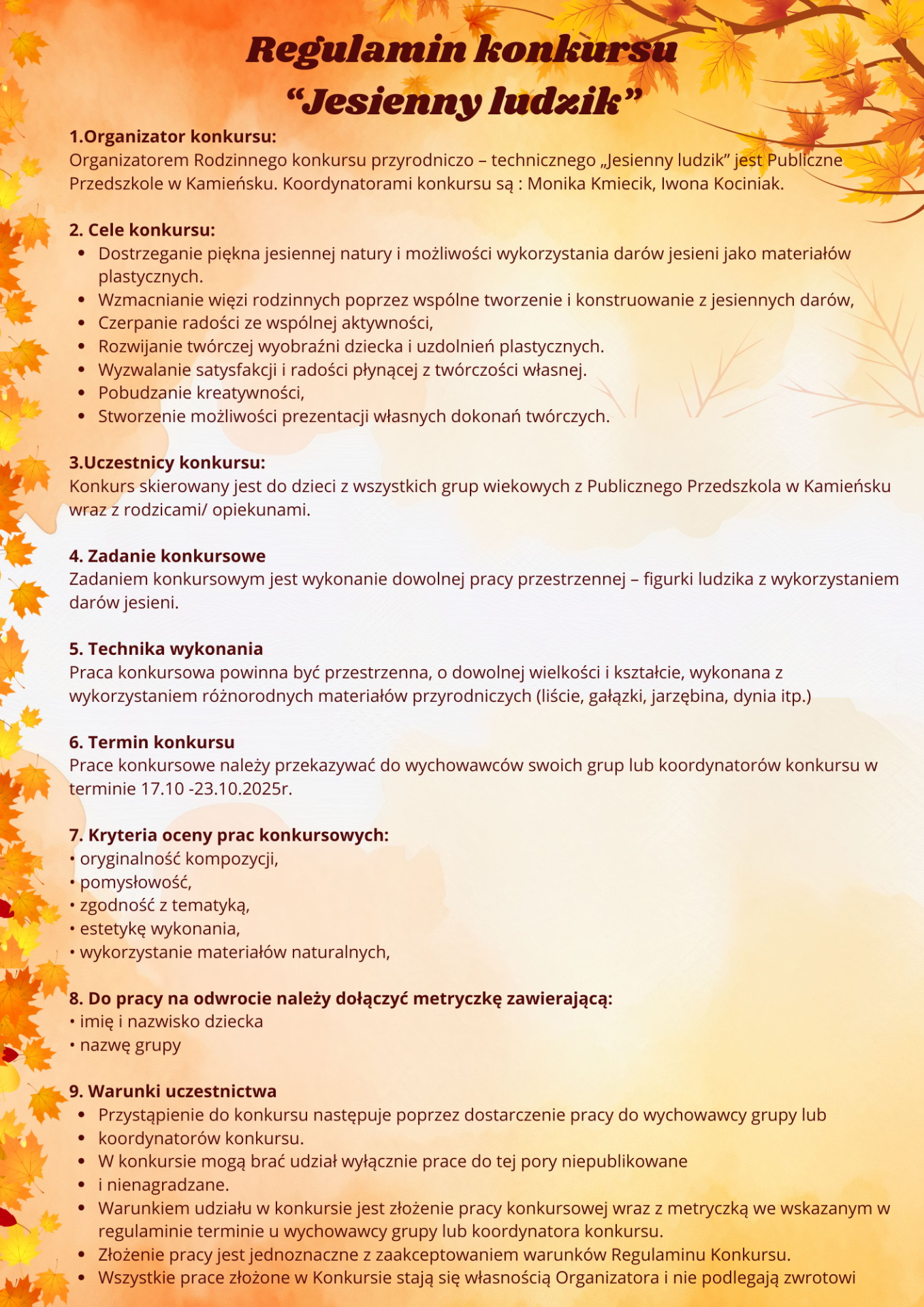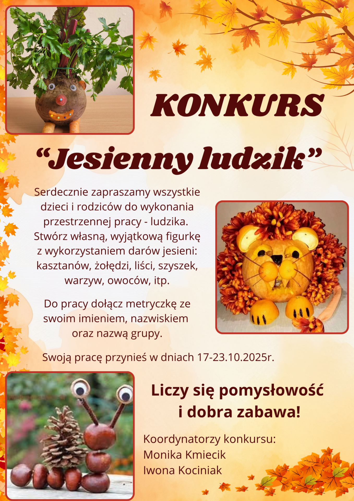 Serdecznie zapraszamy do wzięcia udziału w konkursie rodzinnym pt. Jesienny ludzik. Zadaniem uczestnika jest wykonanie pracy przestrzennej - postaci wykonanej z darów jesieni. Szczegóły znajdziecie państwo w załączonych plikach.