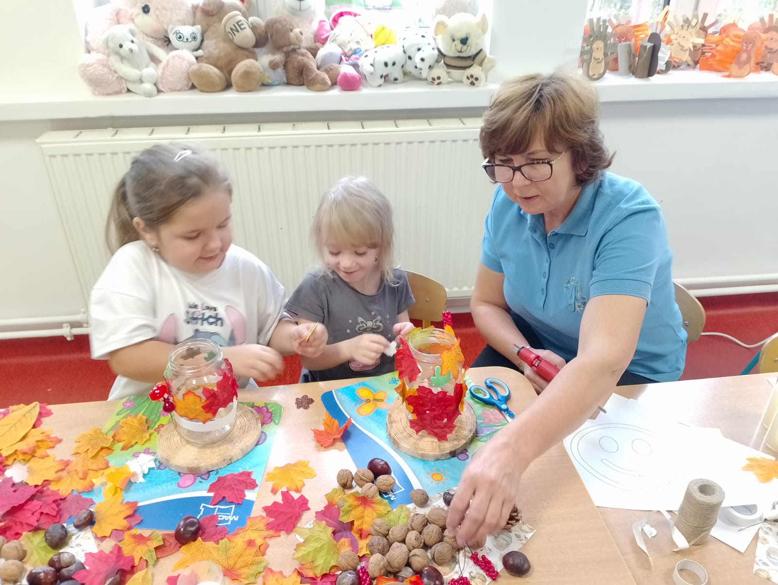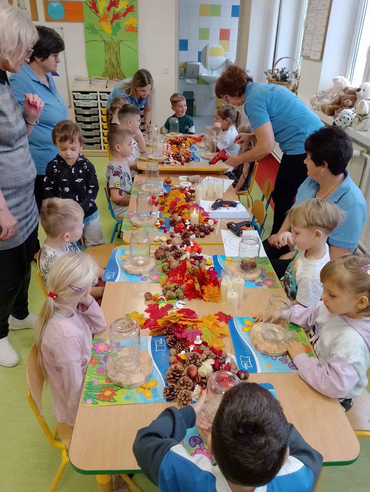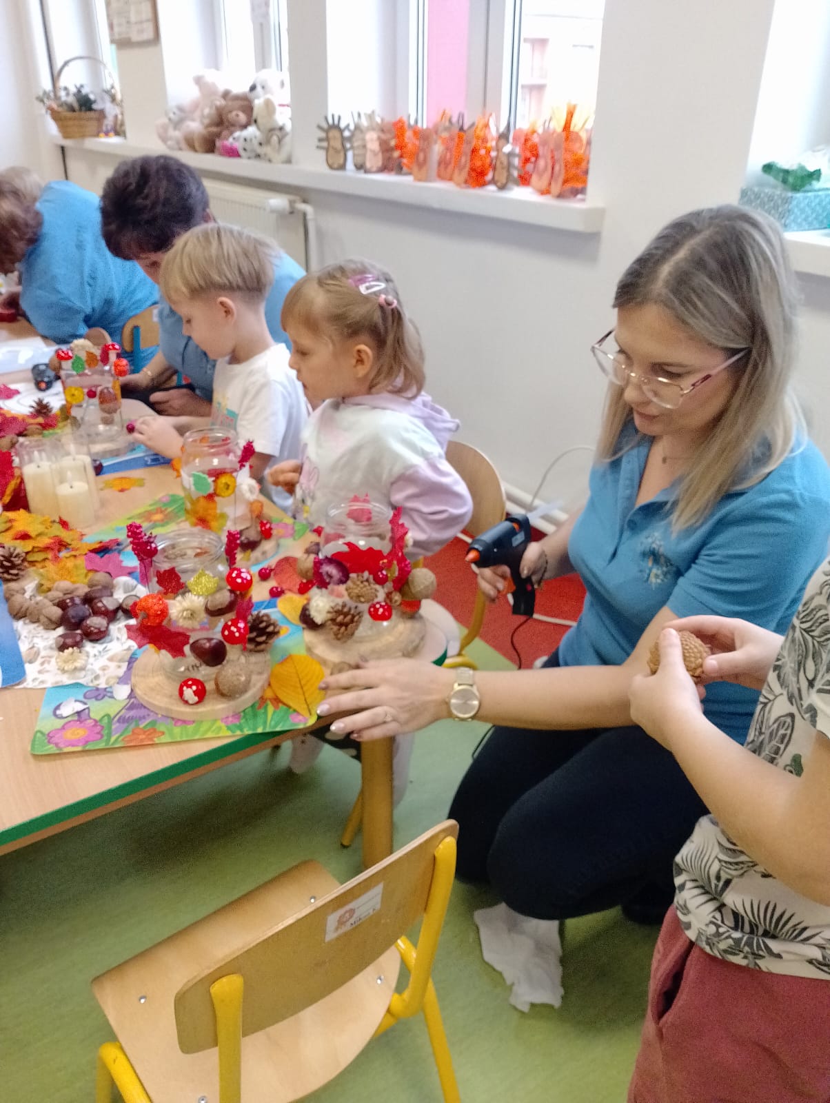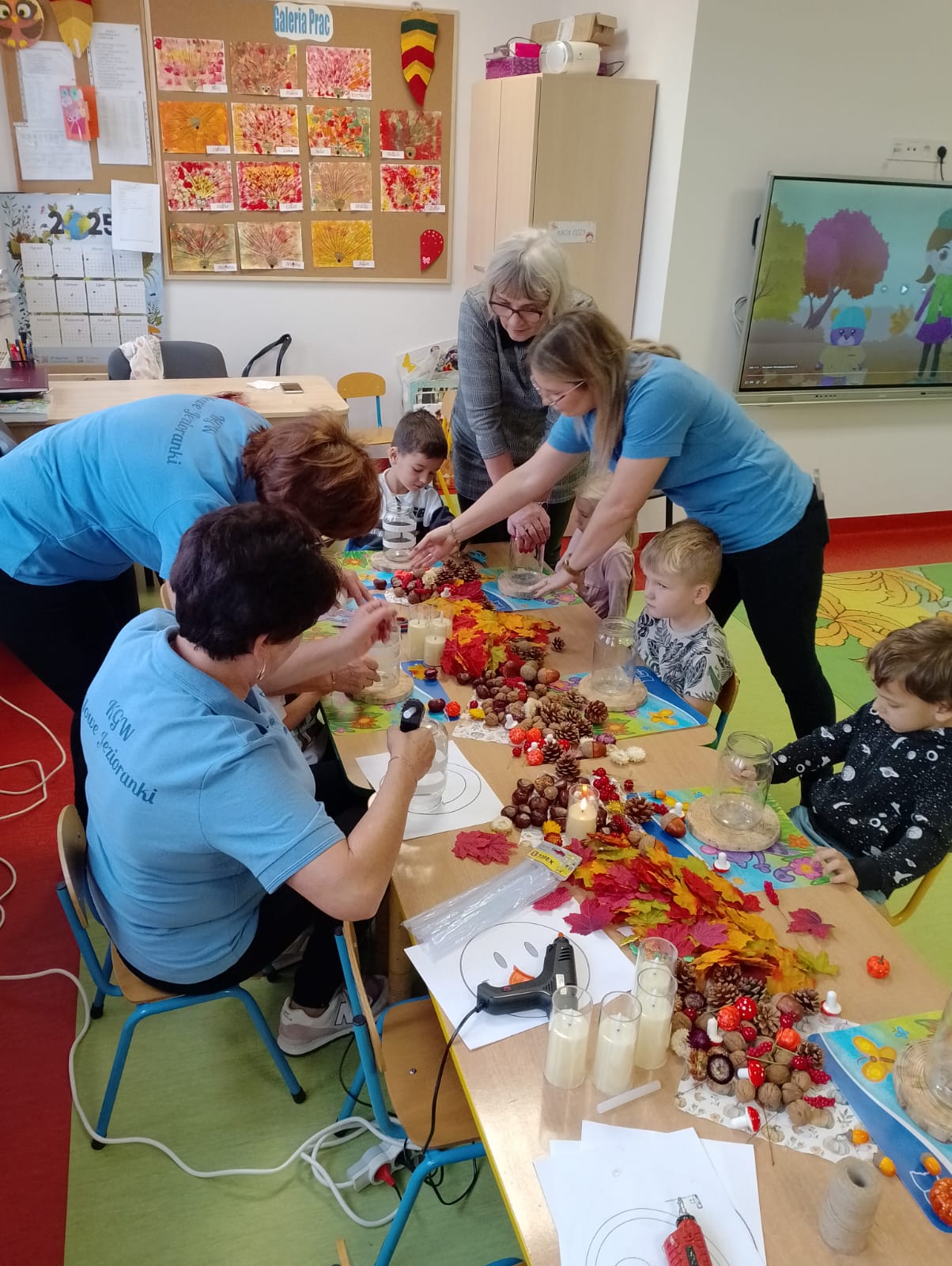 W grupie ,, Motylki" odbyły się wyjątkowe jesienne warsztaty z udziałem Koła Gospodyń Wiejskich NOWE JEZIORANKI , podczas których każde dziecko stworzyło własny, wyjątkowy lampion. Ze słoików i jesiennych darów oraz odrobiny wyobraźni powstały prawdziwe dzieła sztuki. Dzieci z ogromnym zaangażowaniem dekorowały swoje lampiony, a Panie z KGW Nowe Jezioranki  pomagały w klejeniu i ozdabianiu. Wspólne tworzenie to nie tylko świetna zabawa, ale też okazja do rozmów i twórczej współpracy. Każdy lampion stał się symbolem jesiennej magii.