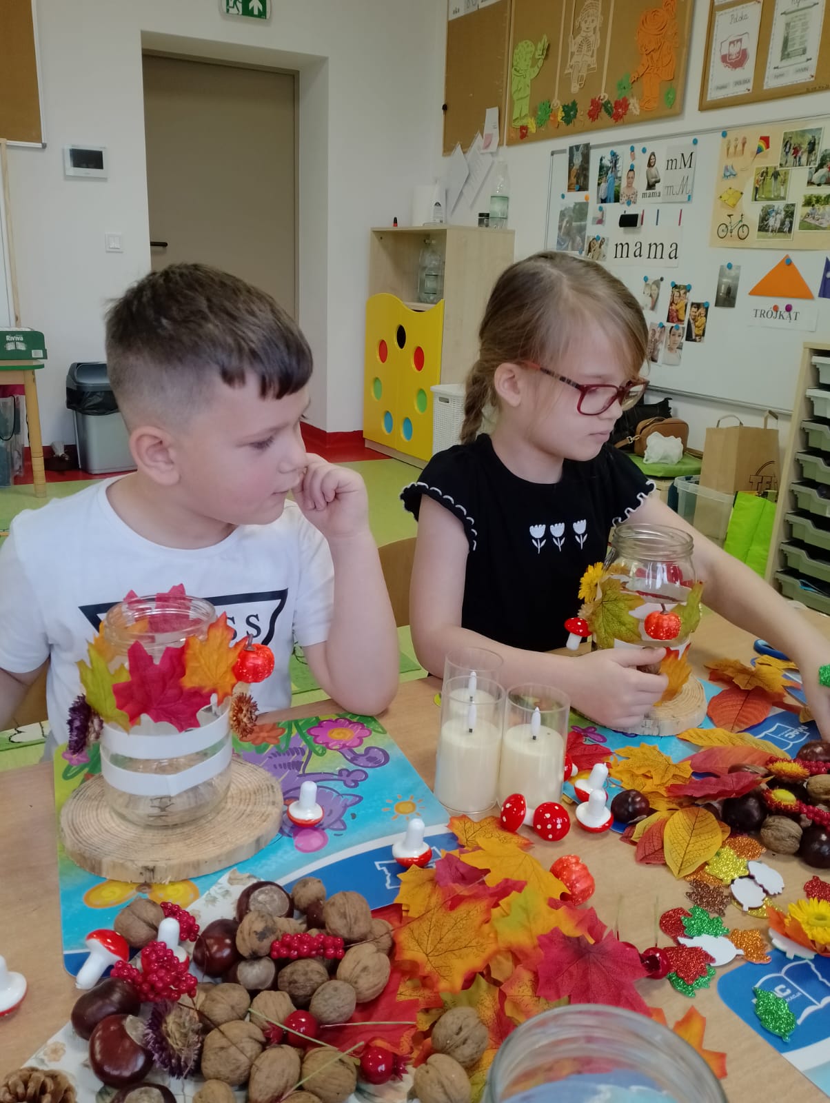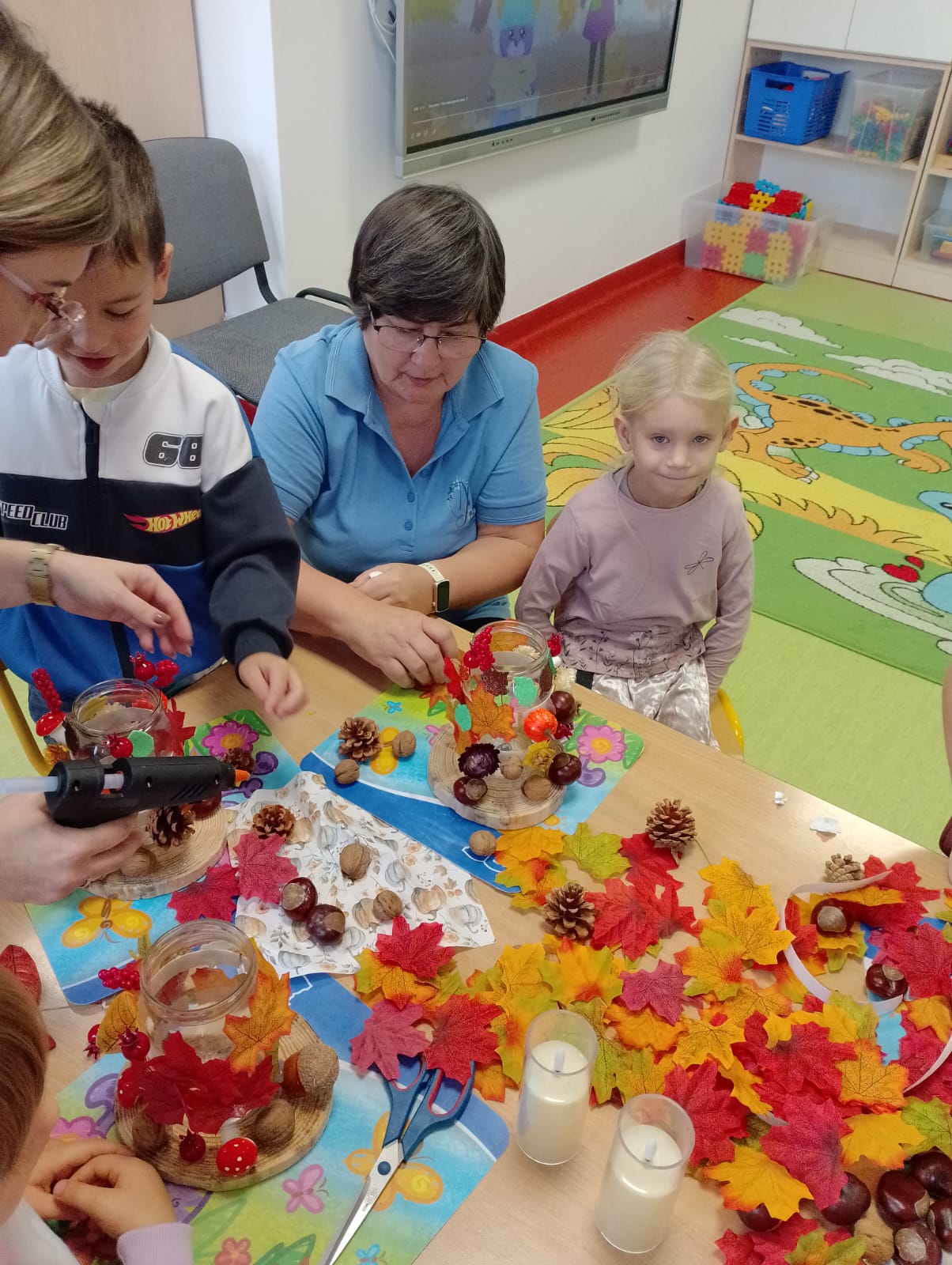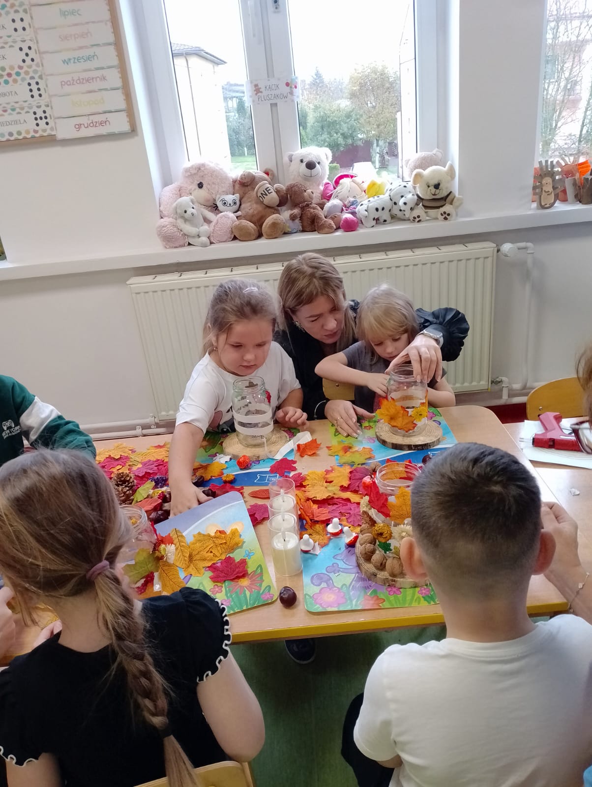 W grupie ,, Motylki" odbyły się wyjątkowe jesienne warsztaty z udziałem Koła Gospodyń Wiejskich NOWE JEZIORANKI , podczas których każde dziecko stworzyło własny, wyjątkowy lampion. Ze słoików i jesiennych darów oraz odrobiny wyobraźni powstały prawdziwe dzieła sztuki. Dzieci z ogromnym zaangażowaniem dekorowały swoje lampiony, a Panie z KGW Nowe Jezioranki  pomagały w klejeniu i ozdabianiu. Wspólne tworzenie to nie tylko świetna zabawa, ale też okazja do rozmów i twórczej współpracy. Każdy lampion stał się symbolem jesiennej magii.
