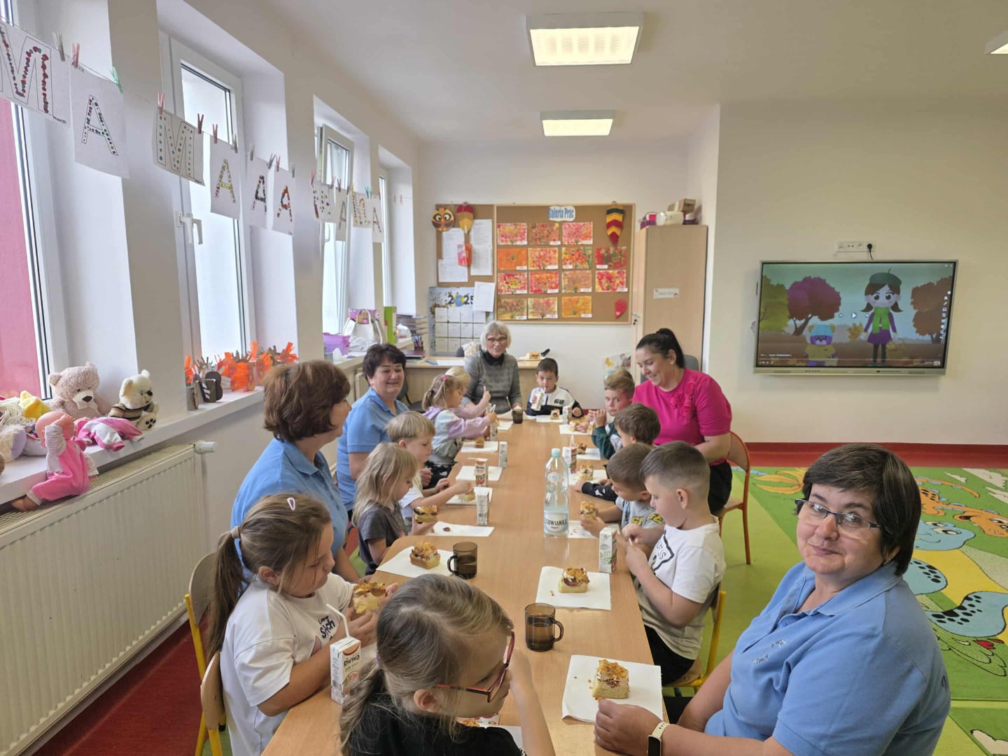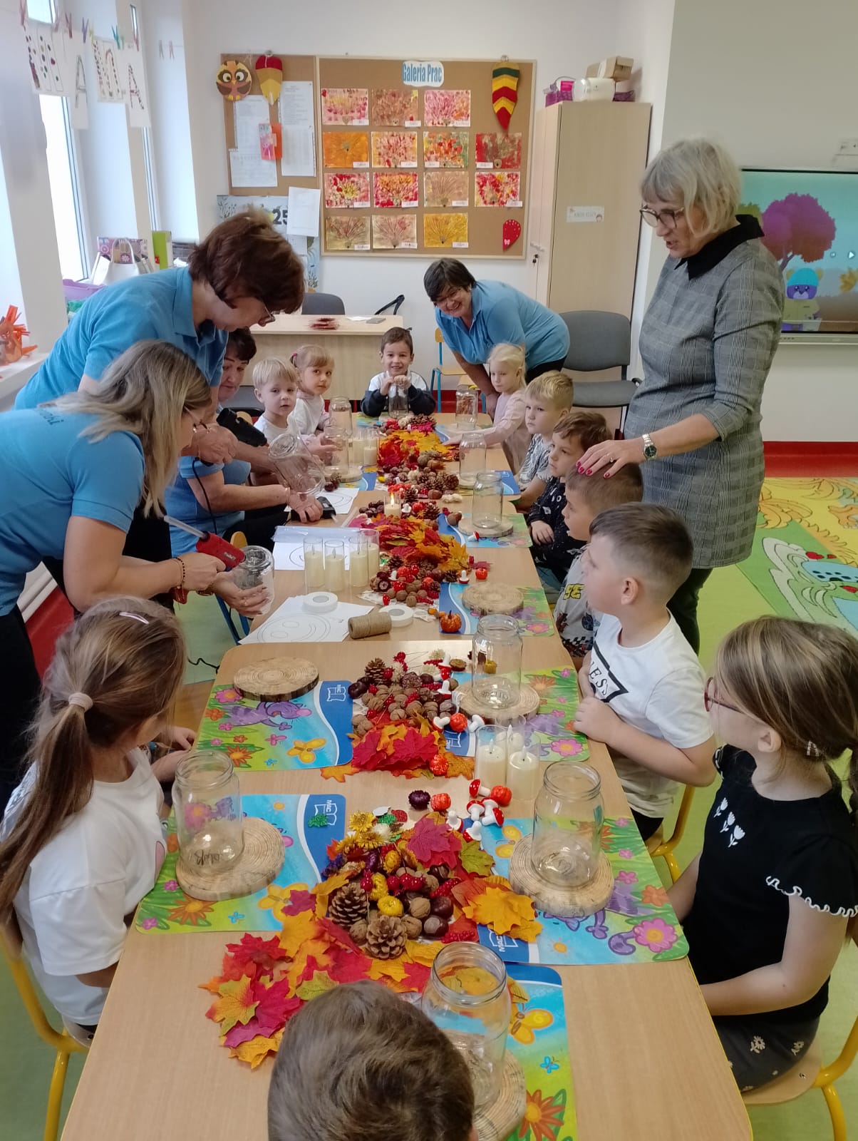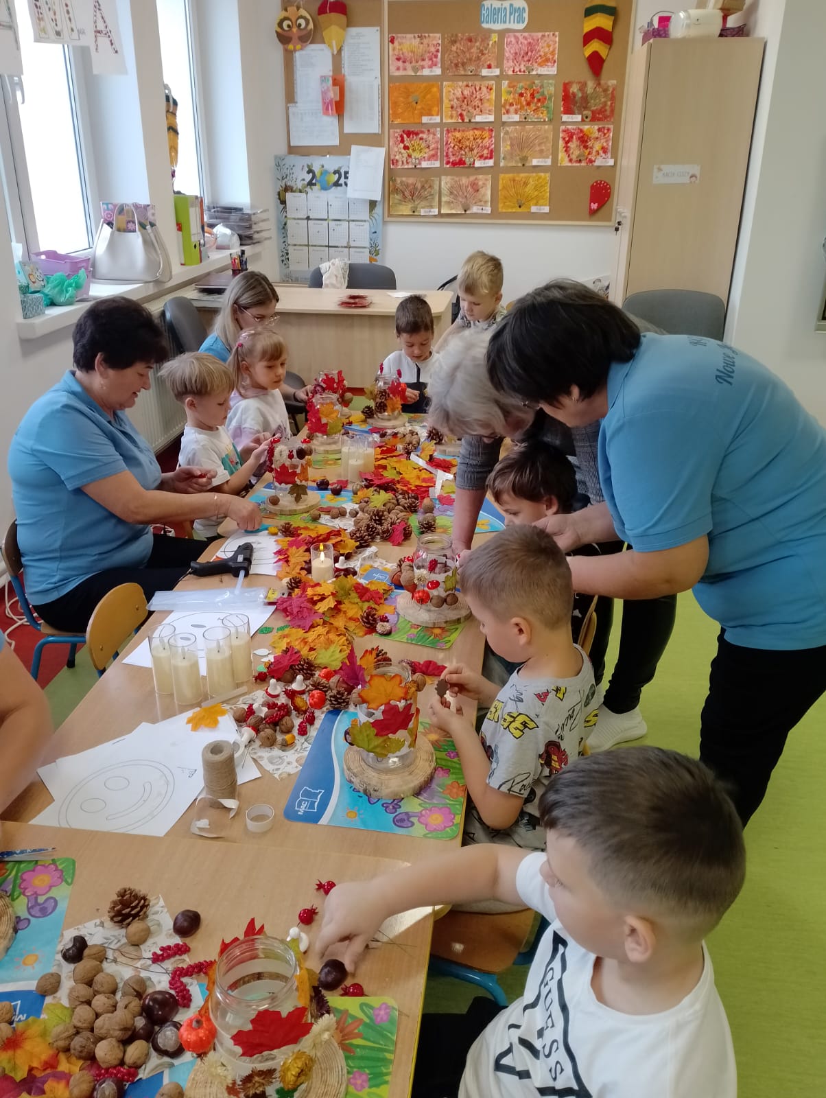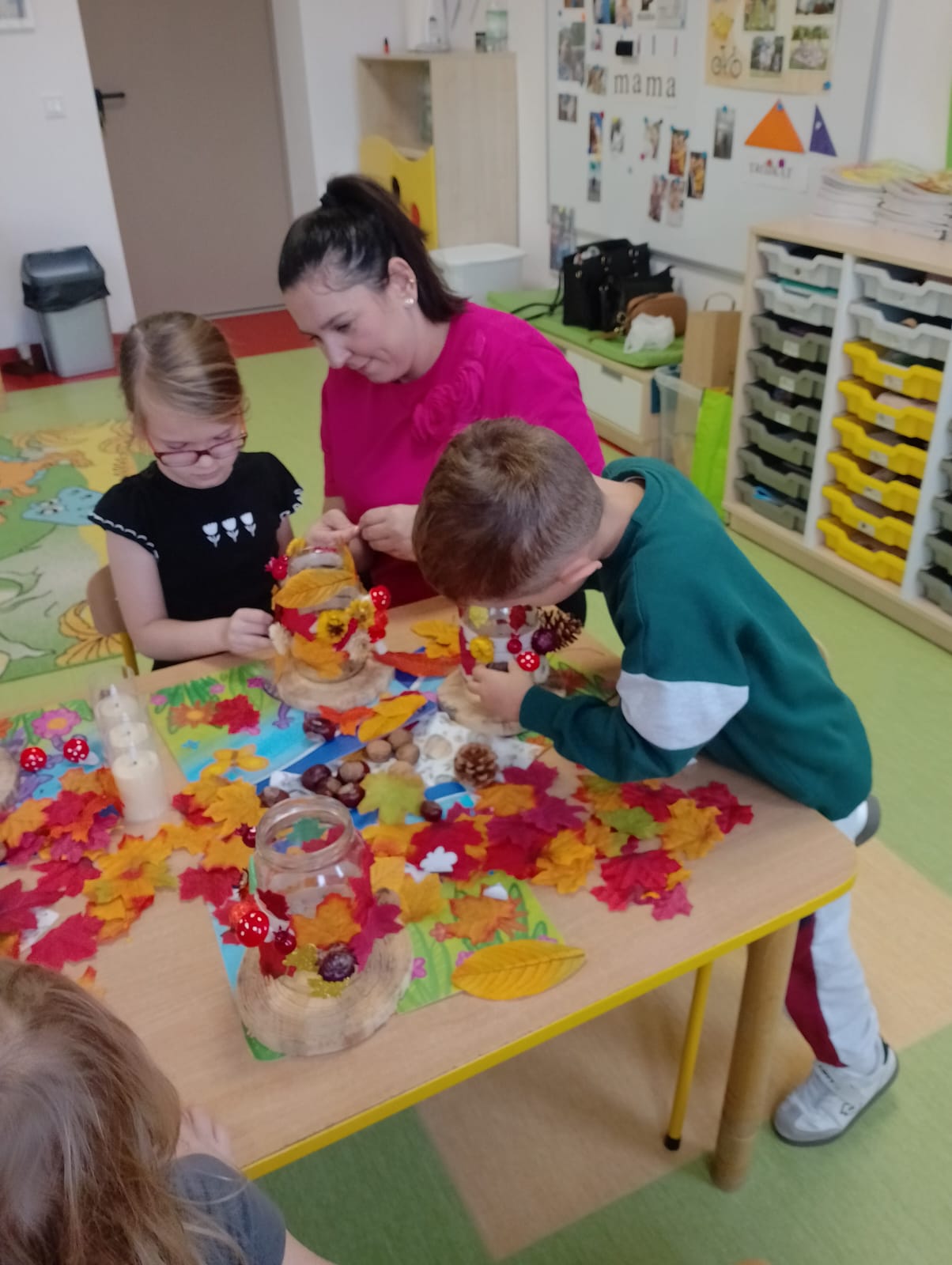 W grupie ,, Motylki" odbyły się wyjątkowe jesienne warsztaty z udziałem Koła Gospodyń Wiejskich NOWE JEZIORANKI , podczas których każde dziecko stworzyło własny, wyjątkowy lampion. Ze słoików i jesiennych darów oraz odrobiny wyobraźni powstały prawdziwe dzieła sztuki. Dzieci z ogromnym zaangażowaniem dekorowały swoje lampiony, a Panie z KGW Nowe Jezioranki  pomagały w klejeniu i ozdabianiu. Wspólne tworzenie to nie tylko świetna zabawa, ale też okazja do rozmów i twórczej współpracy. Każdy lampion stał się symbolem jesiennej magii.