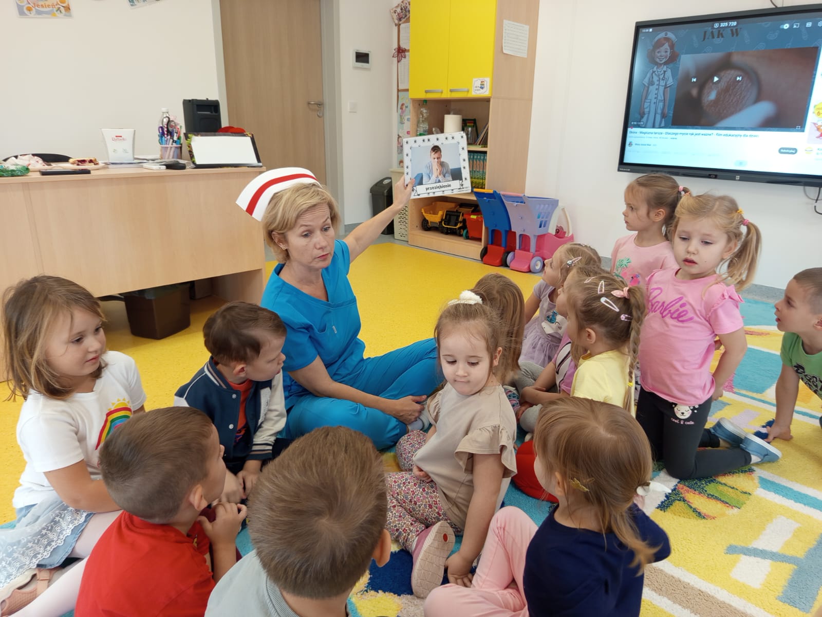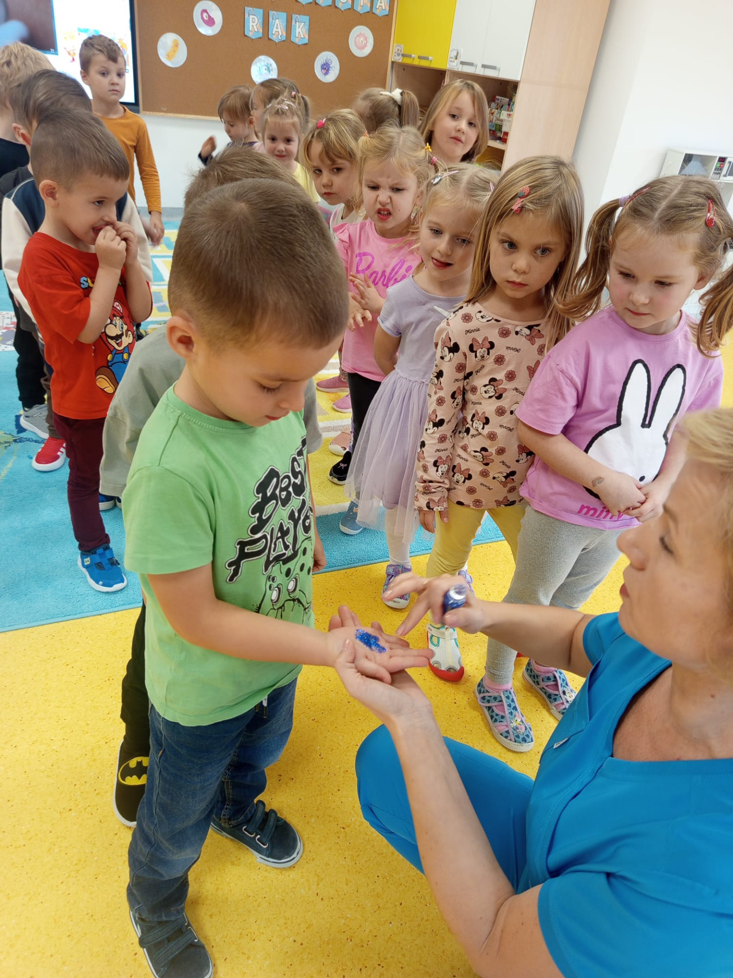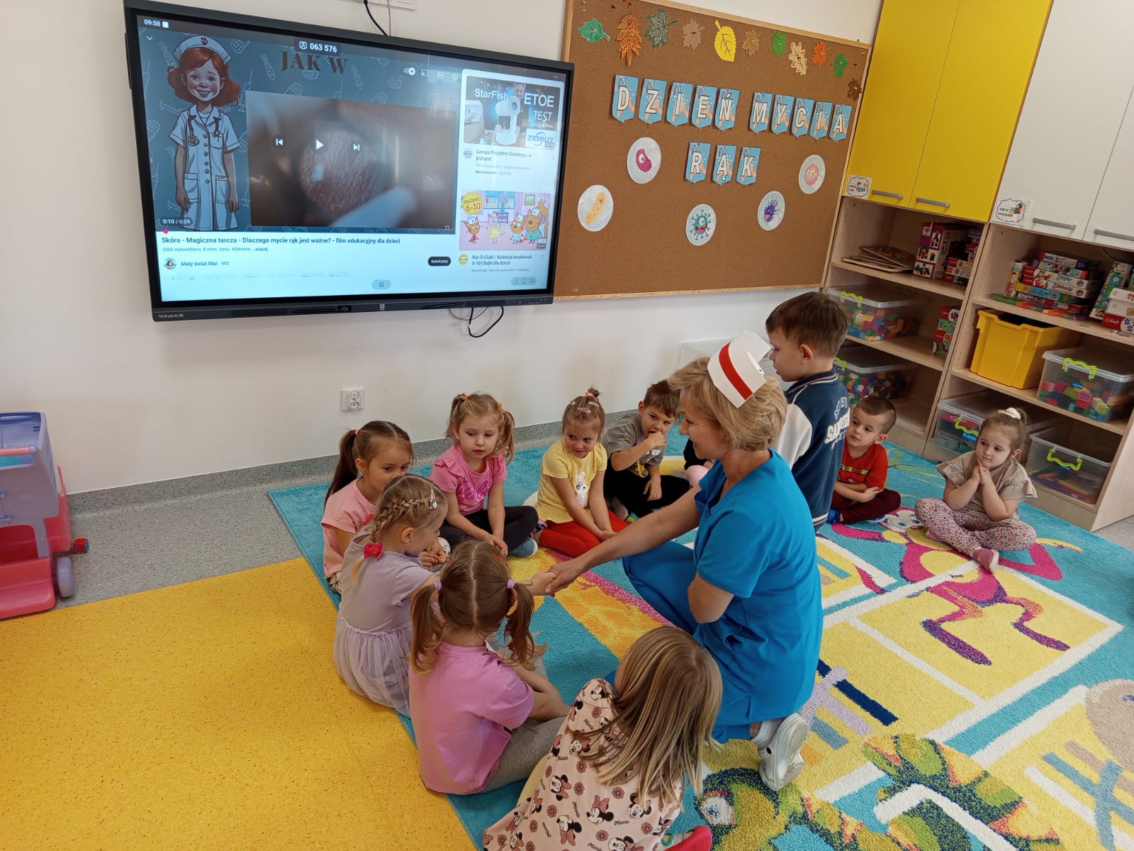 Dziś grupę Liski 🦊odwiedziła Pani Ania Jakubczyk, położna na codzień pracująca w Szpitalu Powiatowym w Radomsku, która w bardzo ciekawy sposób uatrakcyjniła obchody Światowego Dnia Mycia Rąk w naszej grupie,który co roku obchodzony jest 15.10. Pani Ania opowiedziała o tym jak ważne jest mycie rąk i dbanie o higienę, co się dzieje gdy nie myjemy rąk i do czego może doprowadzić. W ciekawy sposób poprzez doświadczenie pokazała co się dzieje z bakteriami i wirusami,gdy używamy tylko wody. Przeczytala opowiadanie o Fenku i jego przygodach z myciem rąk. Pokazała jak prawidłowo myć rączki a na koniec wręczyła pamiątkowe dyplomy i książeczki. Dzieciaki obejrzały również film edukacyjny o zagrożeniach związanych z brakiem higieny a na sam koniec pokolorowaly kolorowankę tematycznie związaną z tematem dzisiejszego dnia. Bardzo dziękujemy Pani Ani za ciekawe zajęcia,które się spotkały z ogromnym entuzjazmem dzieci.😊