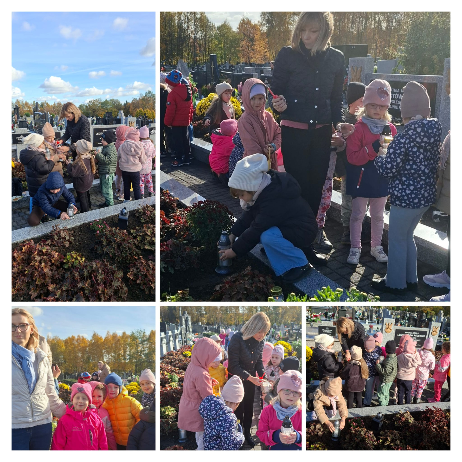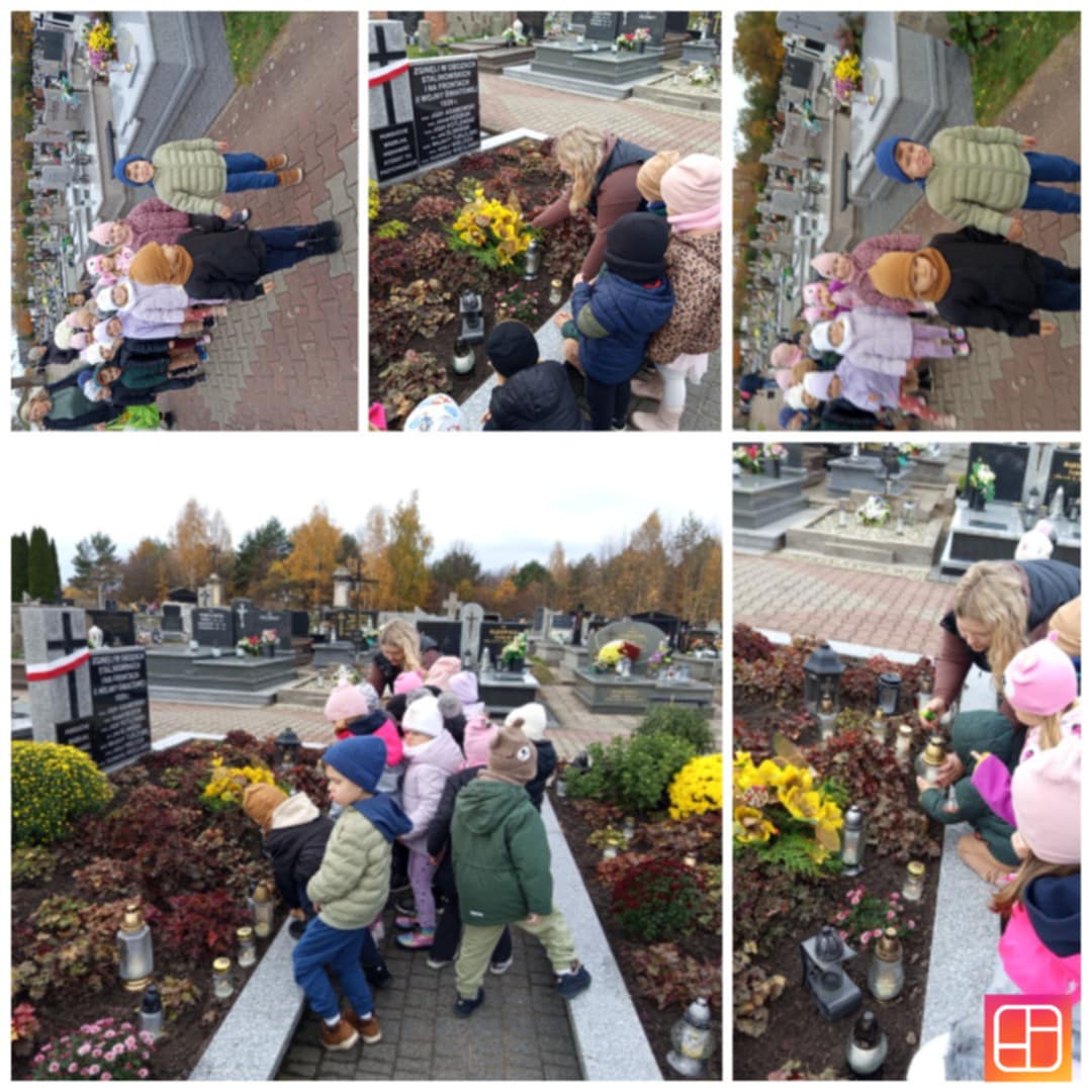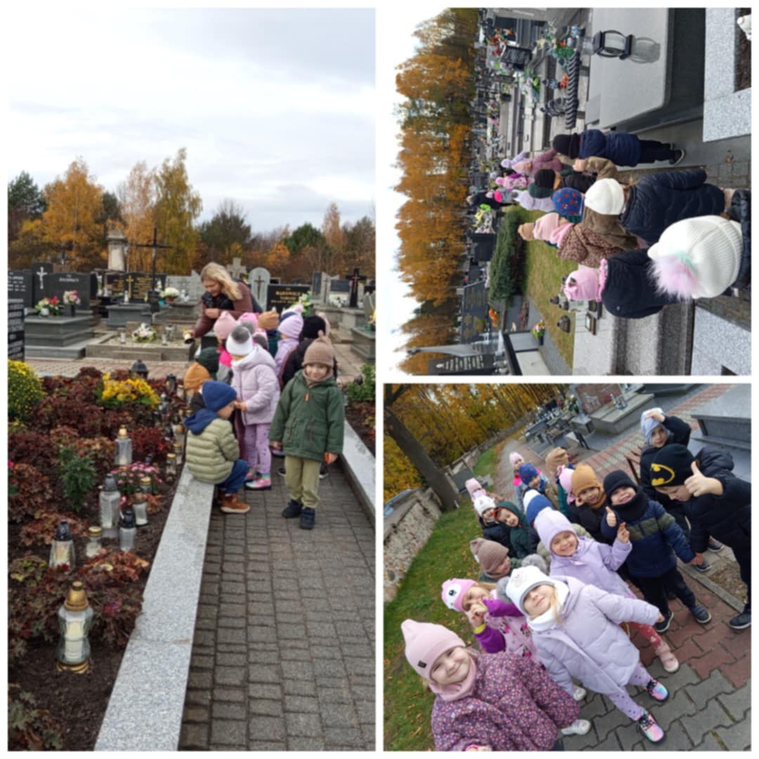W dniach 29 oraz 30 października 2025 roku nasze przedszkolaki wybrały się na spacer na cmentarz parafialny, aby oddać hołd i zapalić znicze na grobach żołnierzy, powstańców, ofiar terroru hitlerowskiego, a także pracowników przedszkola i swojej koleżanki uczęszczającej niegdyś do grupy „Wiewiórki”.