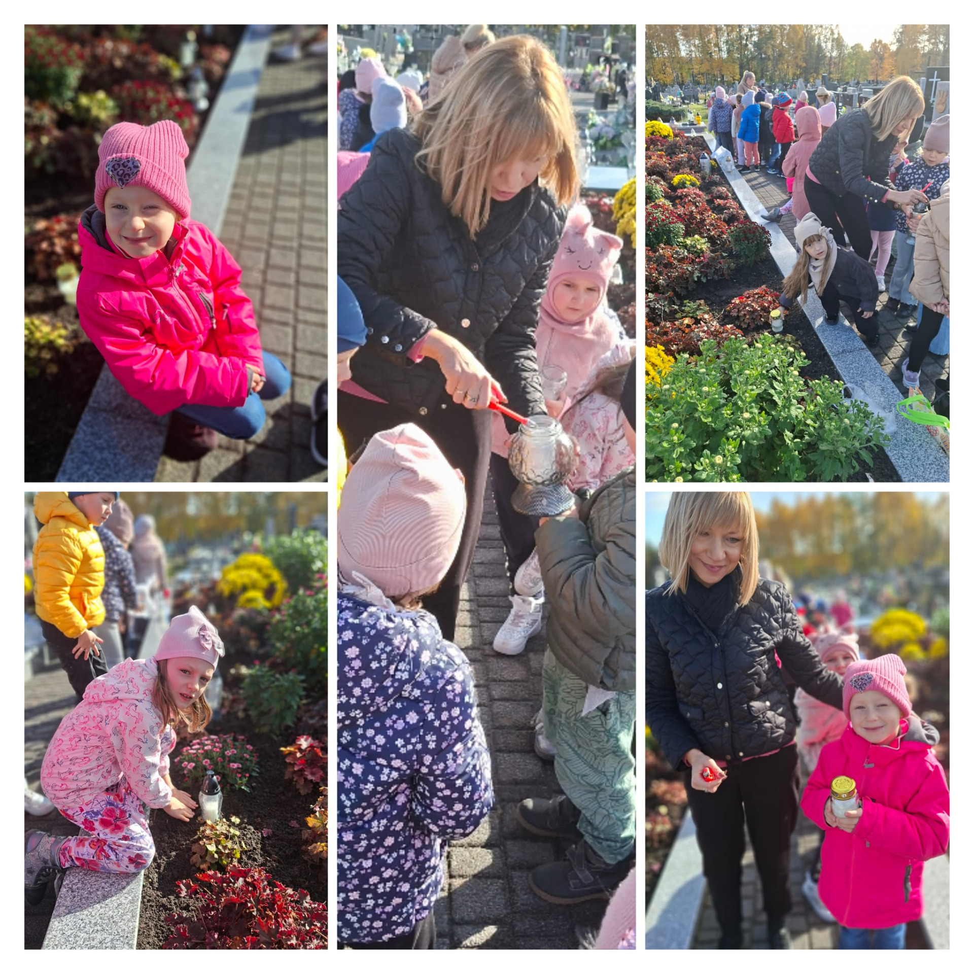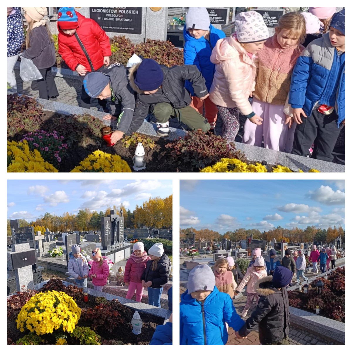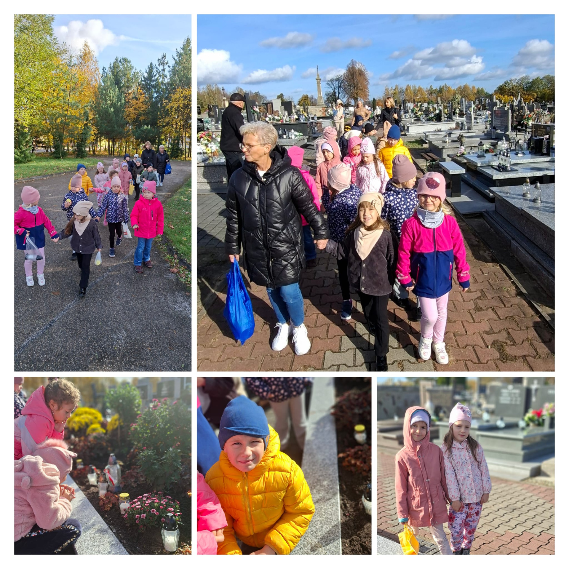 W dniach 29 oraz 30 października 2025 roku nasze przedszkolaki wybrały się na spacer na cmentarz parafialny, aby oddać hołd i zapalić znicze na grobach żołnierzy, powstańców, ofiar terroru hitlerowskiego, a także pracowników przedszkola i swojej koleżanki uczęszczającej niegdyś do grupy „Wiewiórki”.