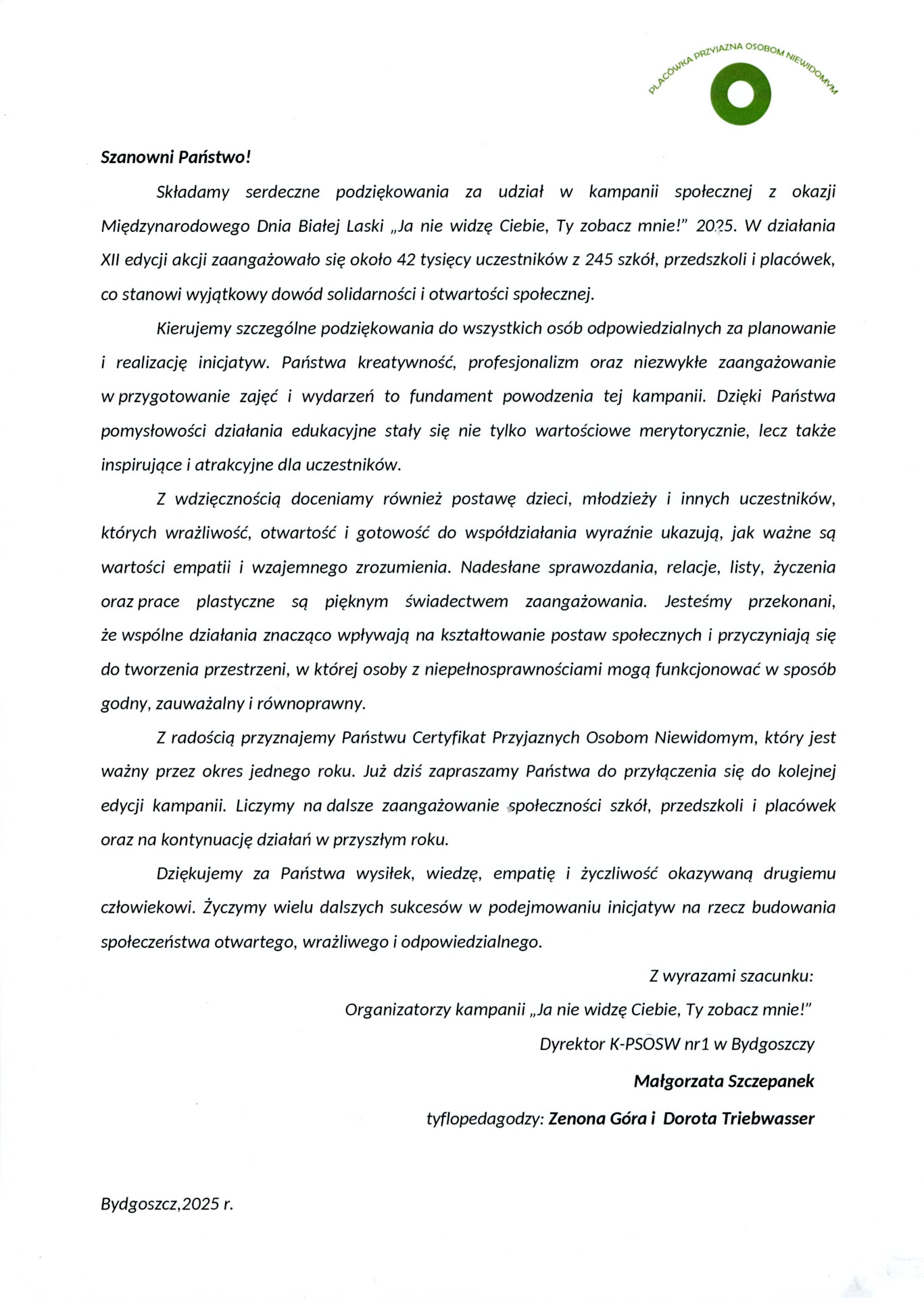 Z przyjemnością informujemy, że nasze działania podjęte w ramach kampanii społecznej "Ja nie widzę Ciebie, Ty zobacz mnie" zostały docenione i od dzisiaj możemy szczycić się certyfikatem "Przedszkola Przyjaznego Osobom Niewidomym". Przypominamy, że celem tej kampanii było: