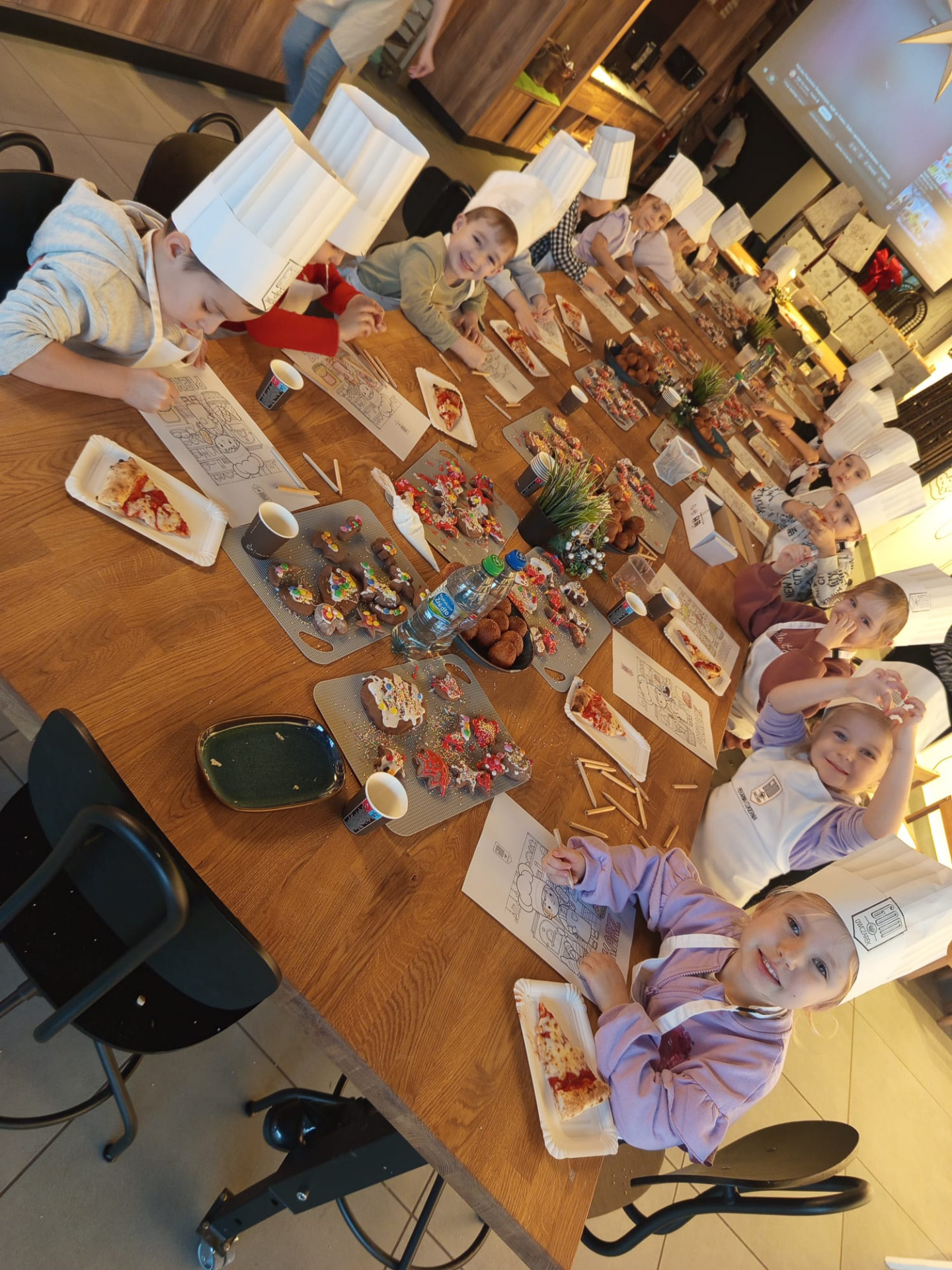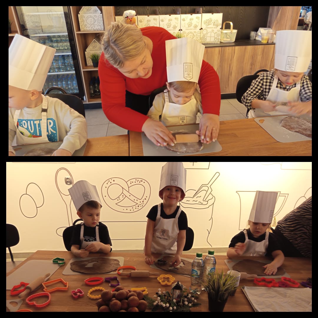 Już na wejściu dzieci przywitała pięknie udekorowana choinka, a każde z nich otrzymało fartuszek, czapkę oraz pudełko w kształcie domku, by móc zabrać swoje wypieki do domu. Podczas zajęć przedszkolaki poznały cały proces powstawania piernikowego ciasta. Z zapałem wałkowały, formowały i wykrawały świąteczne kształty. 🎄🎁Po upieczeniu nadszedł najbardziej wyczekiwany moment – ozdabianie pierniczków kolorowymi lukrami, posypkami i słodkimi dodatkami. Każde dziecko stworzyło własne, niepowtarzalne słodkie dzieła.